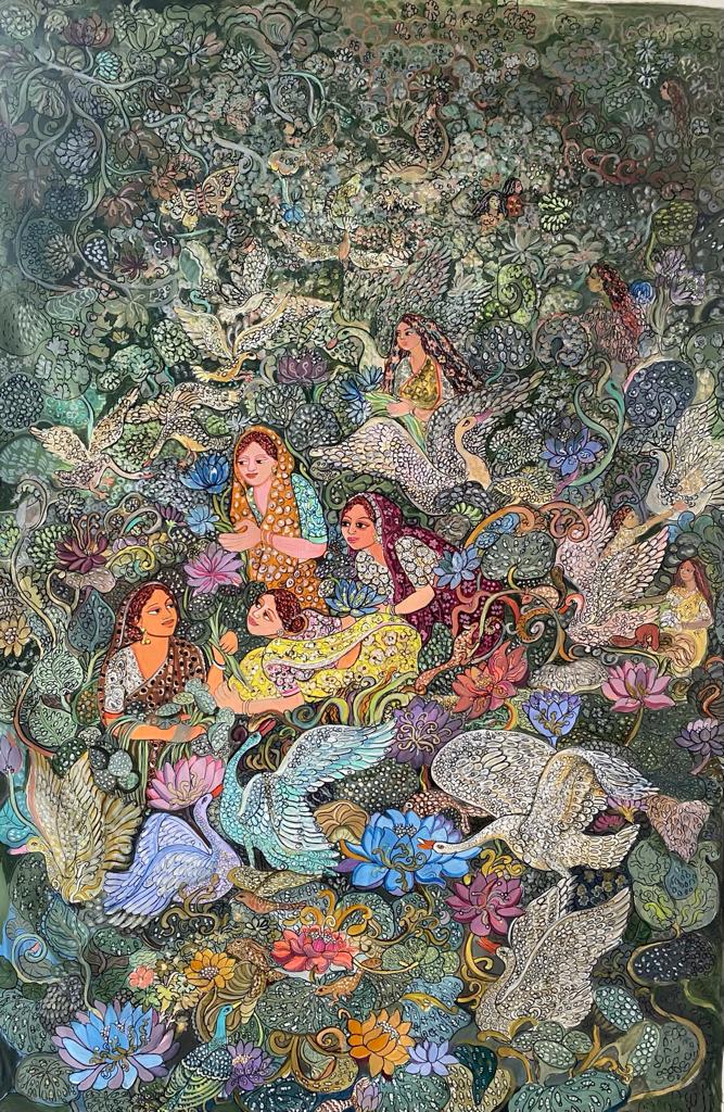Chaitali Chanda says, “Nature in abundance has been inspiration of life since my childhood. I love the trees drooping with the ripe overweight fruits. They remind me of the women carrying children with love and care. I feel joyous to observe the opulence of our land with rich colours of flora and fauna. The birds and insects gather around the bursting ripe papaya or the blossoming beetle nuts. For me the fruiting trees come alive as expecting mothers”.