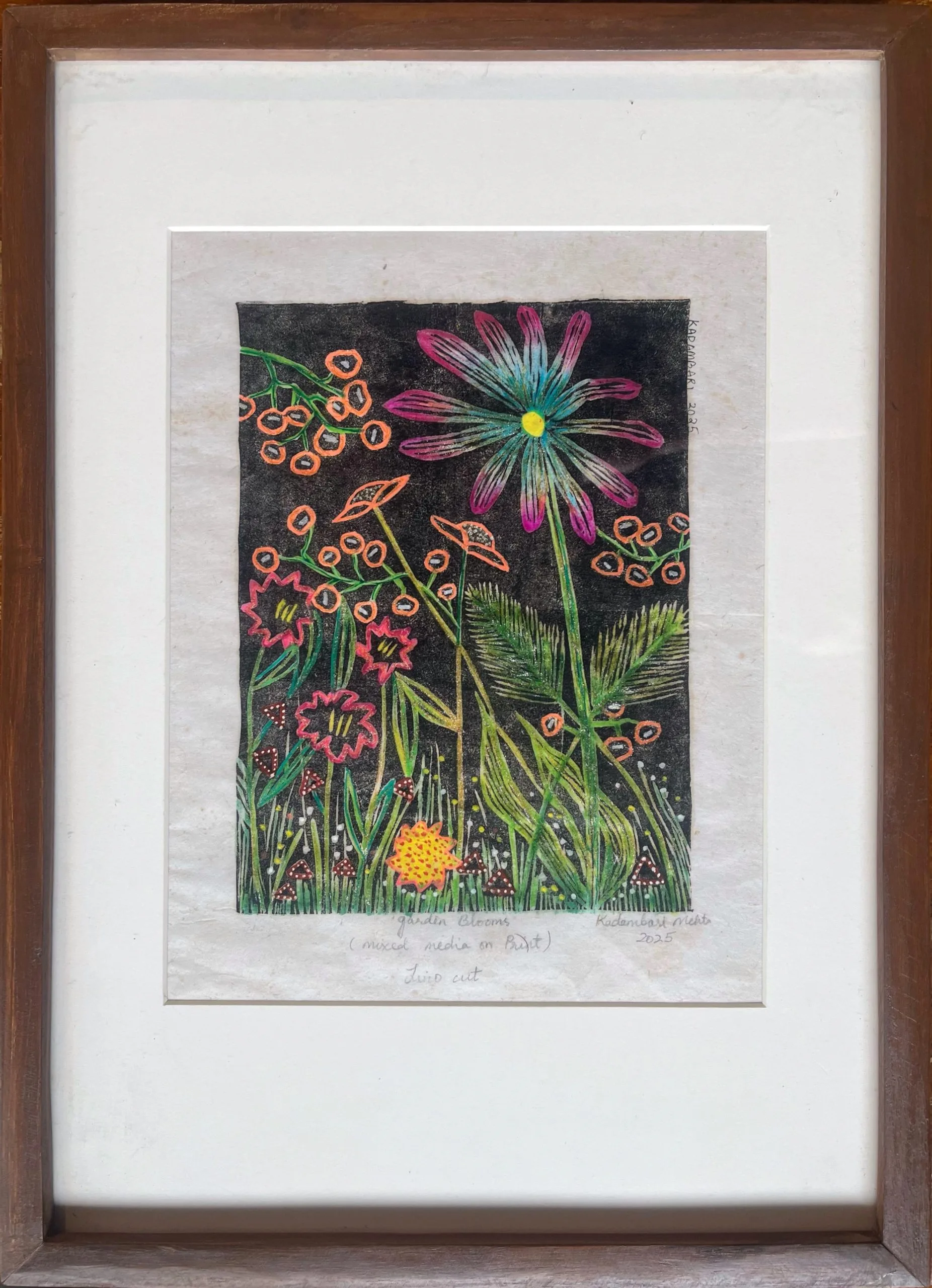 'Garden Blooms' | 2025 | 8” x 6” with teak wood frame - 16.5” x 12” | kadambarimehta | Mixed Media on Print Lino cut