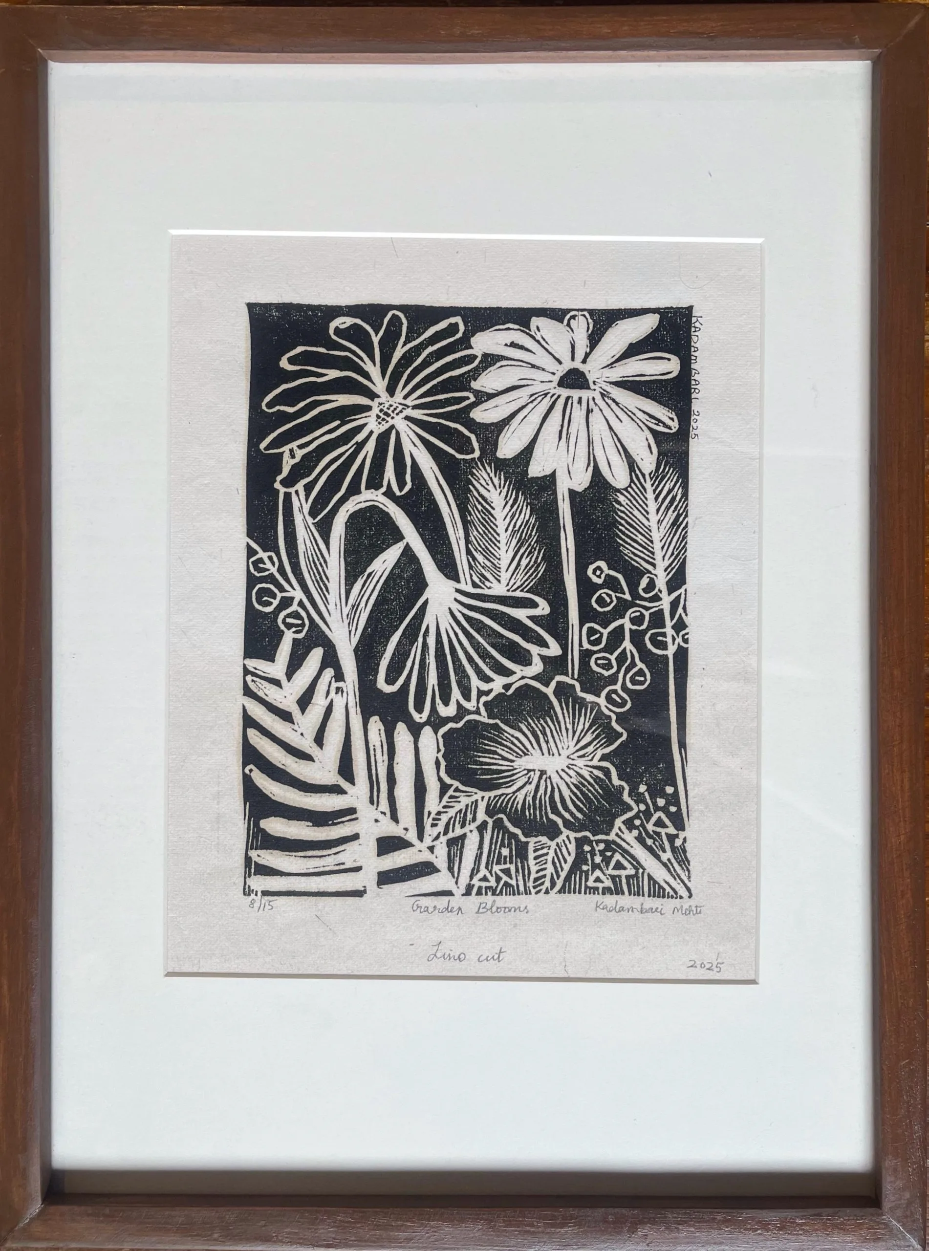 'Garden Blooms' | 2025 | 8” x 6” with teak wood frame - 16.5” x 12” | kadambarimehta | Mixed Media on Print Lino cut